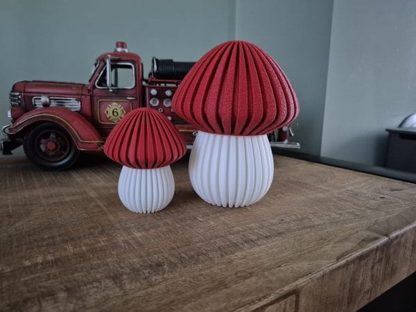 Deze unieke 3D-geprinte paddenstoellampjes zijn een bijzondere toevoeging aan ieder interieur. Ze brengen een zachte, uitnodigende gloed in huis en combineren de precisie van moderne techniek met een speels, ambachtelijk gevoel. Ze worden met zorg geprint.